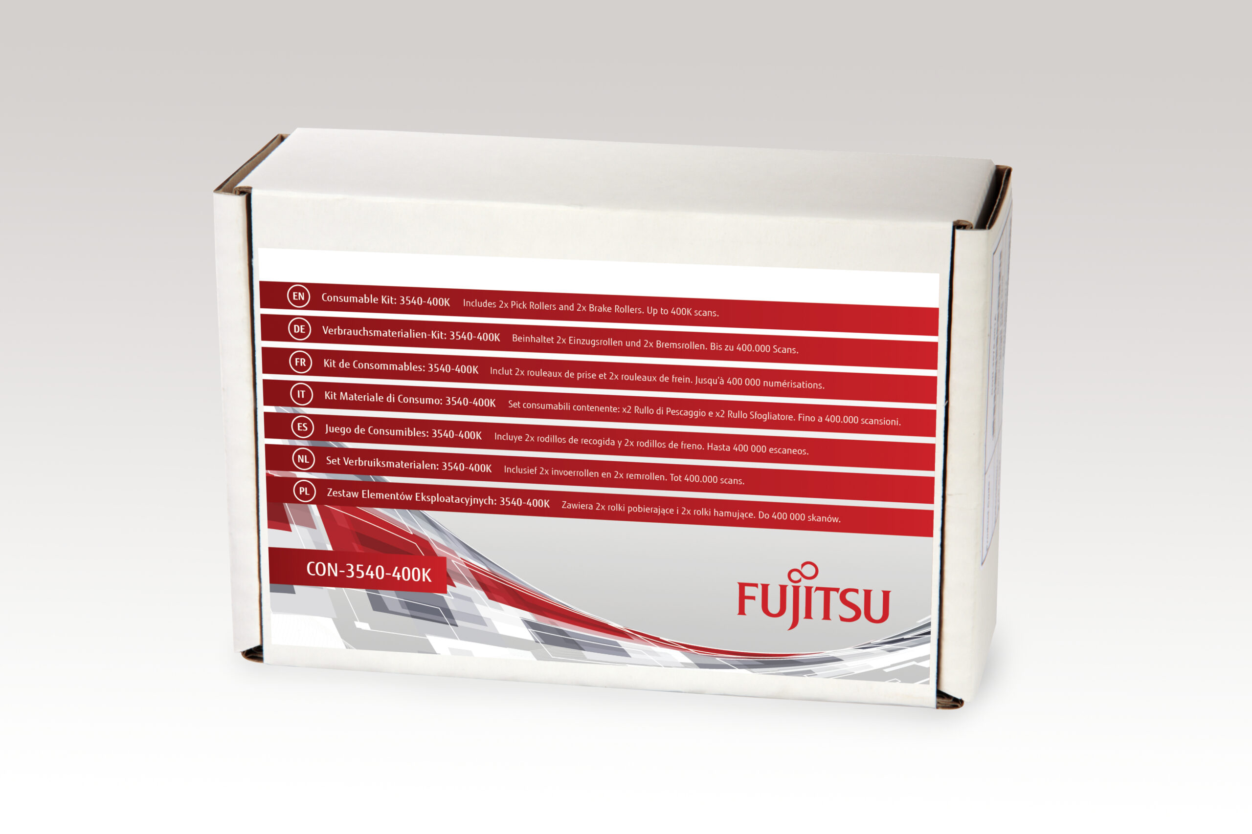 Zestaw eksploatacyjny RICOH CON-3540-400K (stary numer katalogowy: CON-3540-011A) to komponenty przeznaczone do utrzymania ciągłości pracy skanerów dokumentów Fujitsu serii fi-6130, fi-6230, fi-6140 i fi-6240. Zawiera dwie rolki pobierające oraz dwie rolki hamujące, kluczowe dla precyzyjnego podawania dokumentów. Zestaw gwarantuje szacowaną żywotność do 400 000 skanów, wspierając stabilność operacyjną w środowiskach biznesowych.